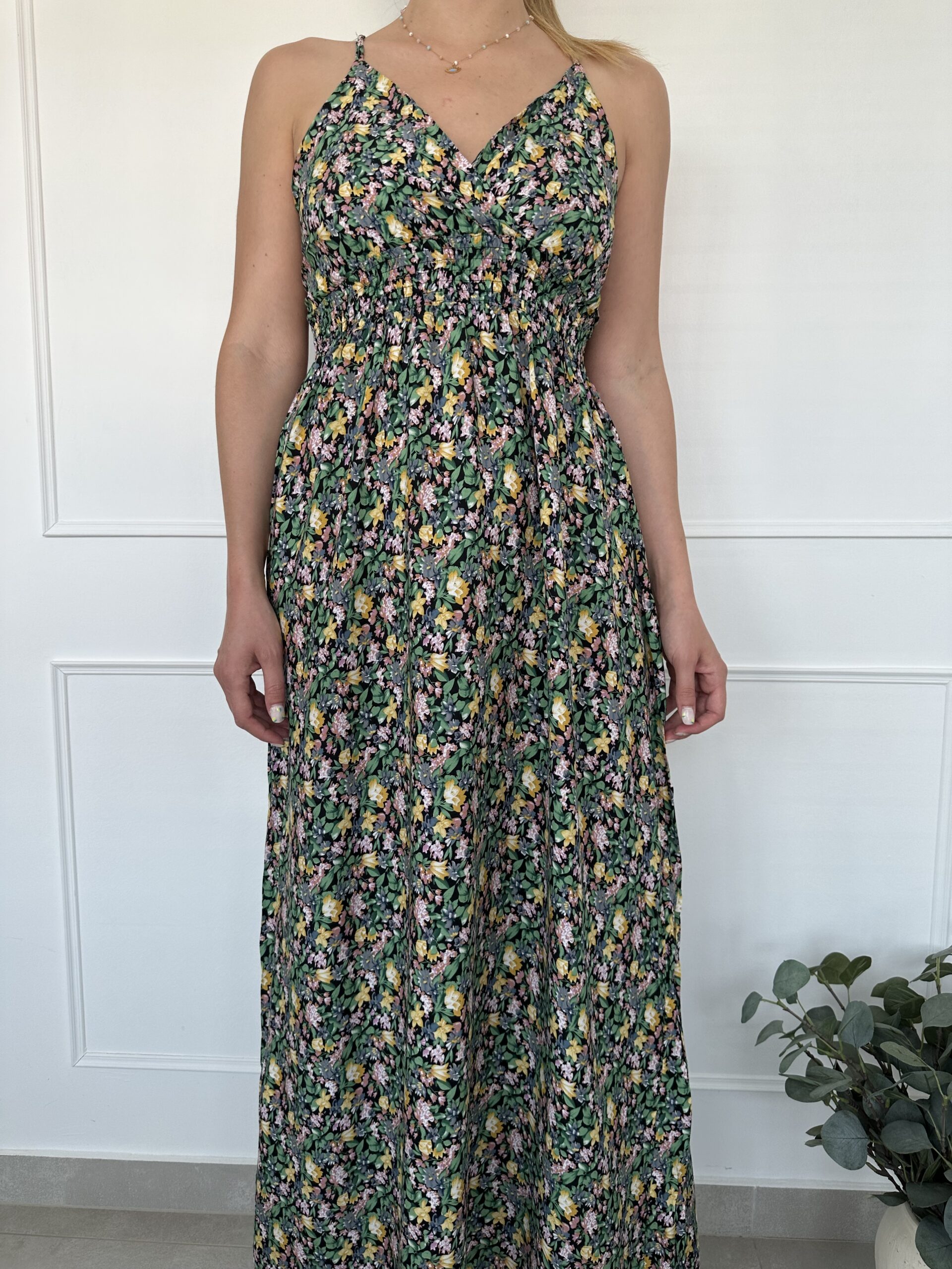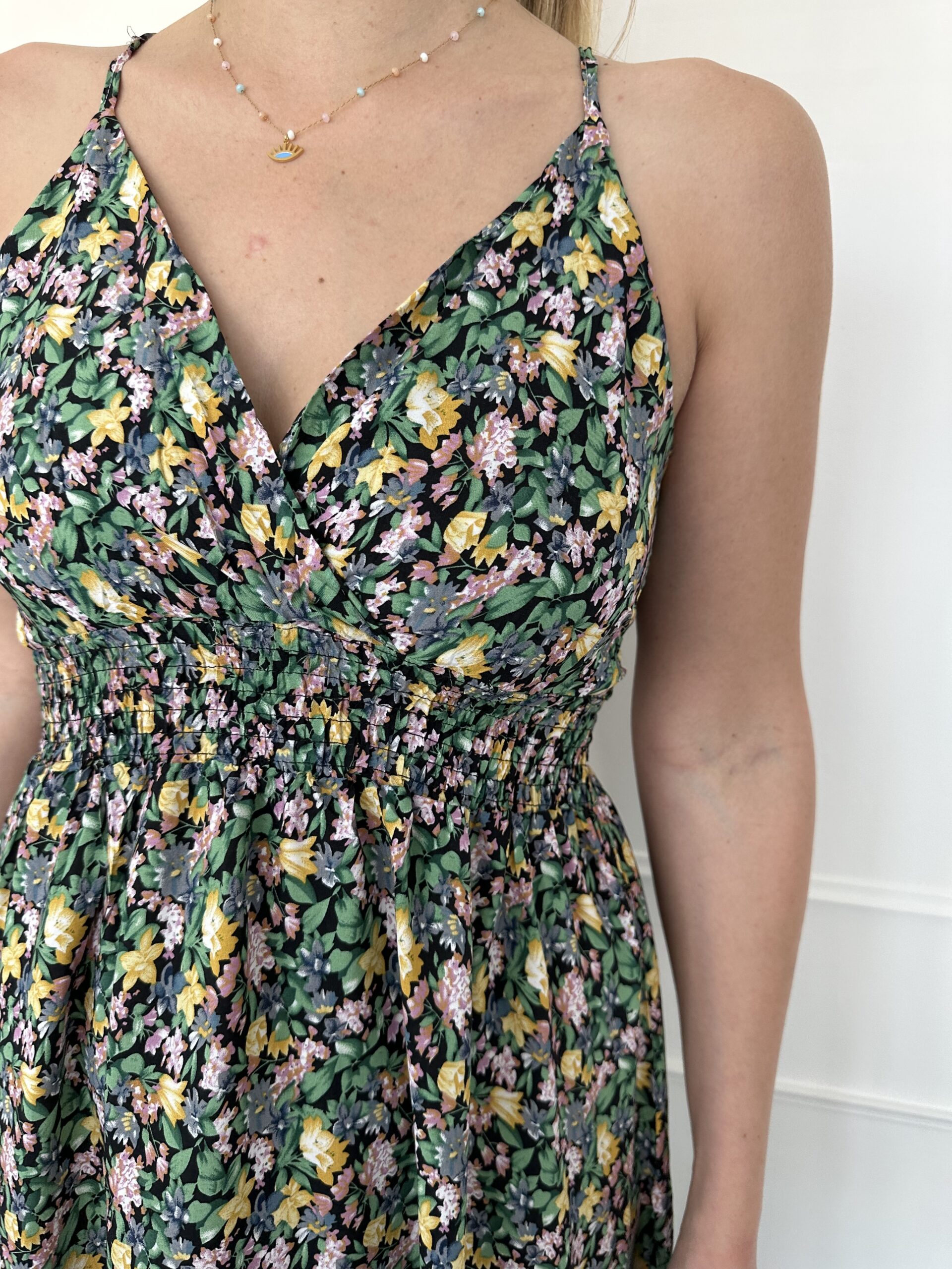 Φόρεμα με λουλούδια, κρουαζέ στο στήθος, τριγωνάκι. Το ραντάκι ρυθμίζεται. Έχει λάστιχο σφηκοφωλιά στην πλάτη και κάτω από το στήθος.