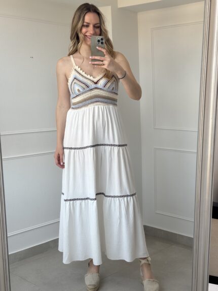 Φόρεμα δροσερό με λάστιχο στη μέση, κορδονάκι και κουμπιά στο στήθος. Στο μανίκι έχει ρεβέρ.