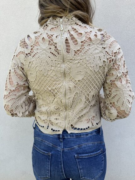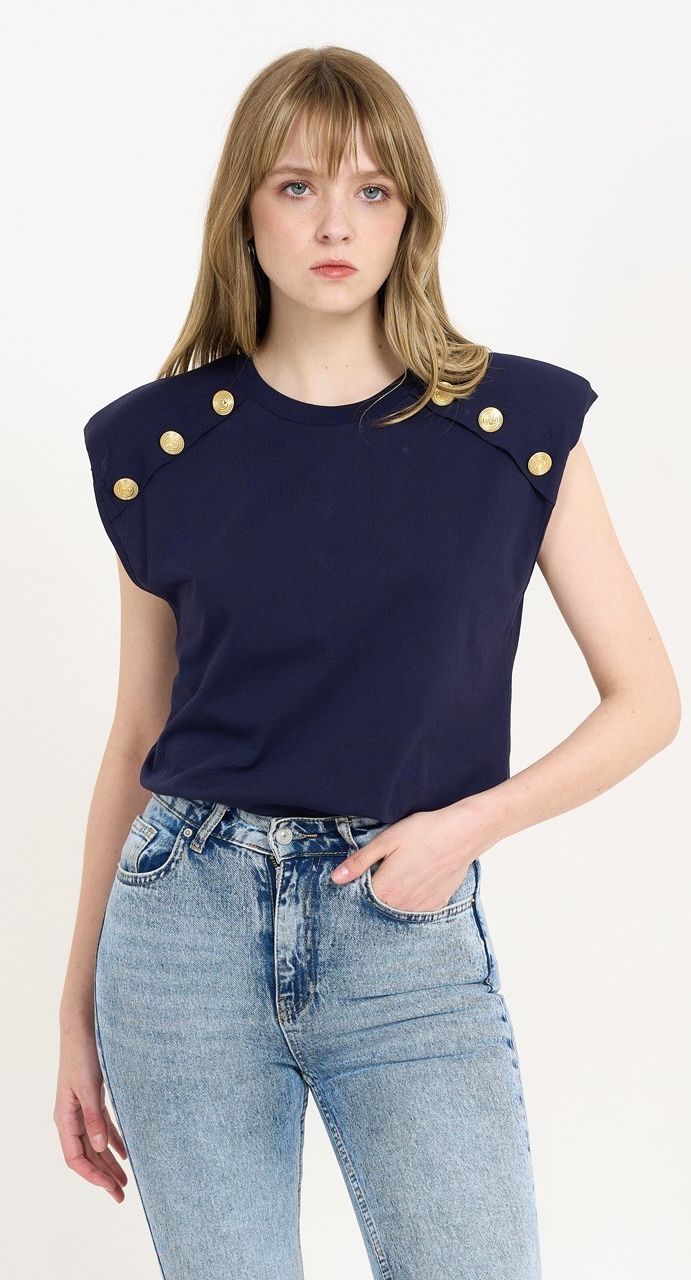 Μπλουζάκι μακό με χρυσά κουμπιά στους ώμους και βάτες. Τα κουμπιά είναι πλαστικά.
