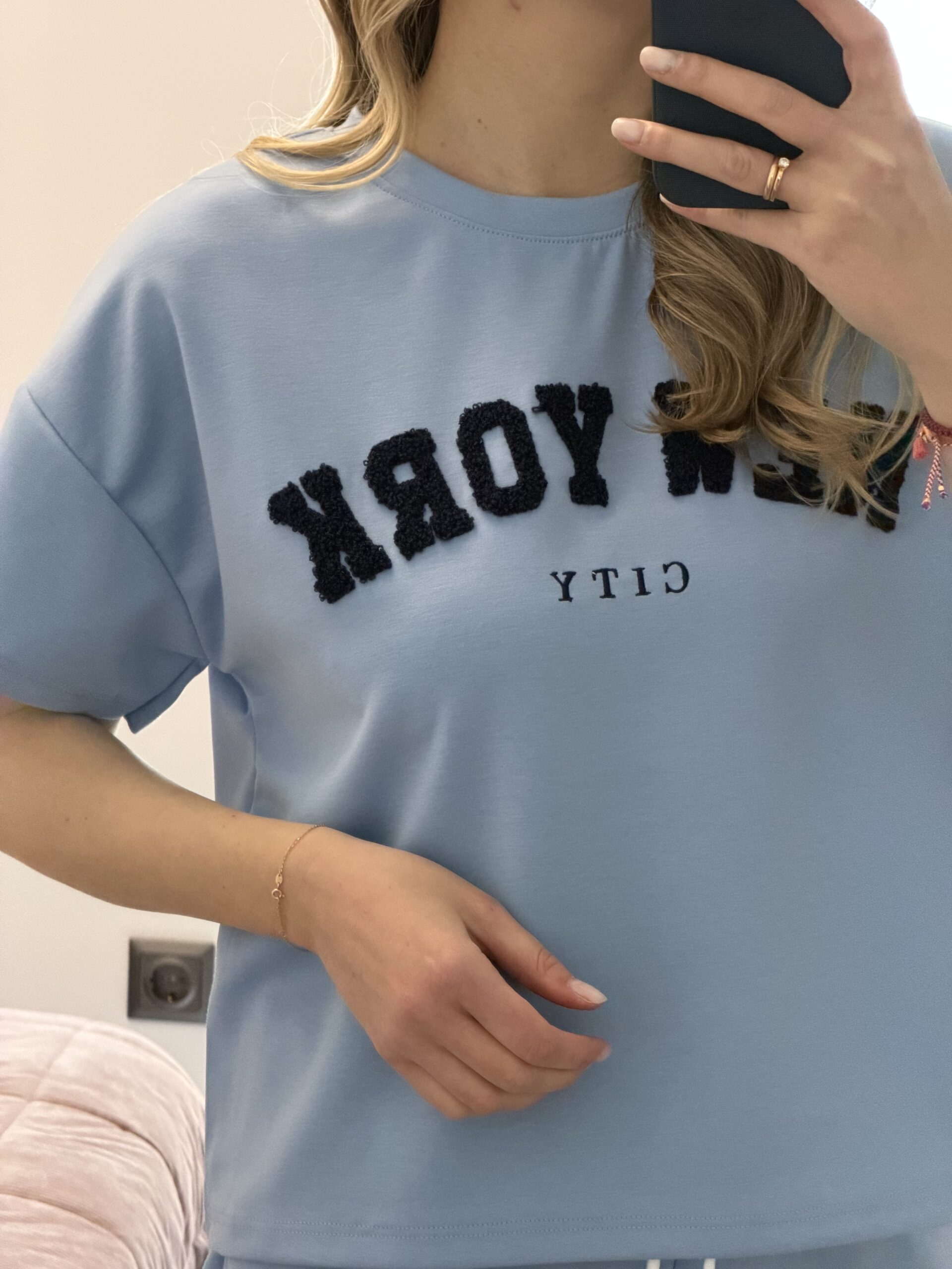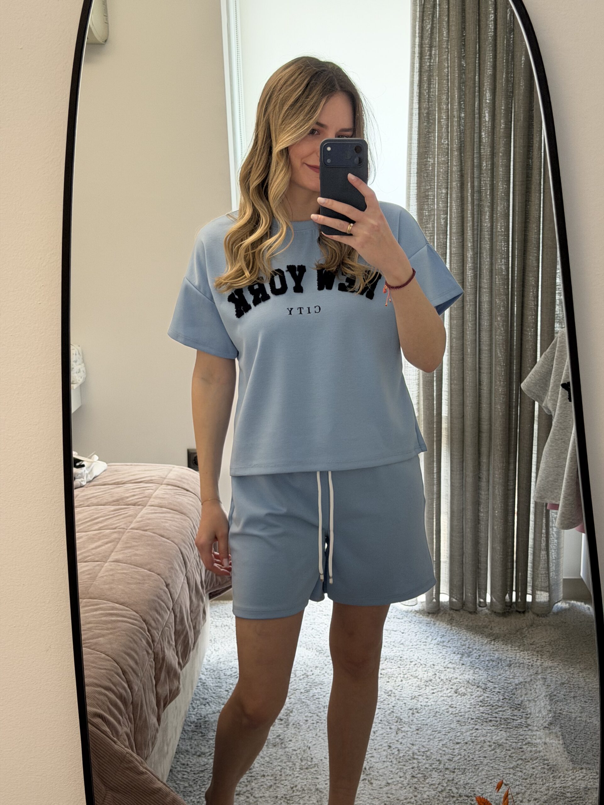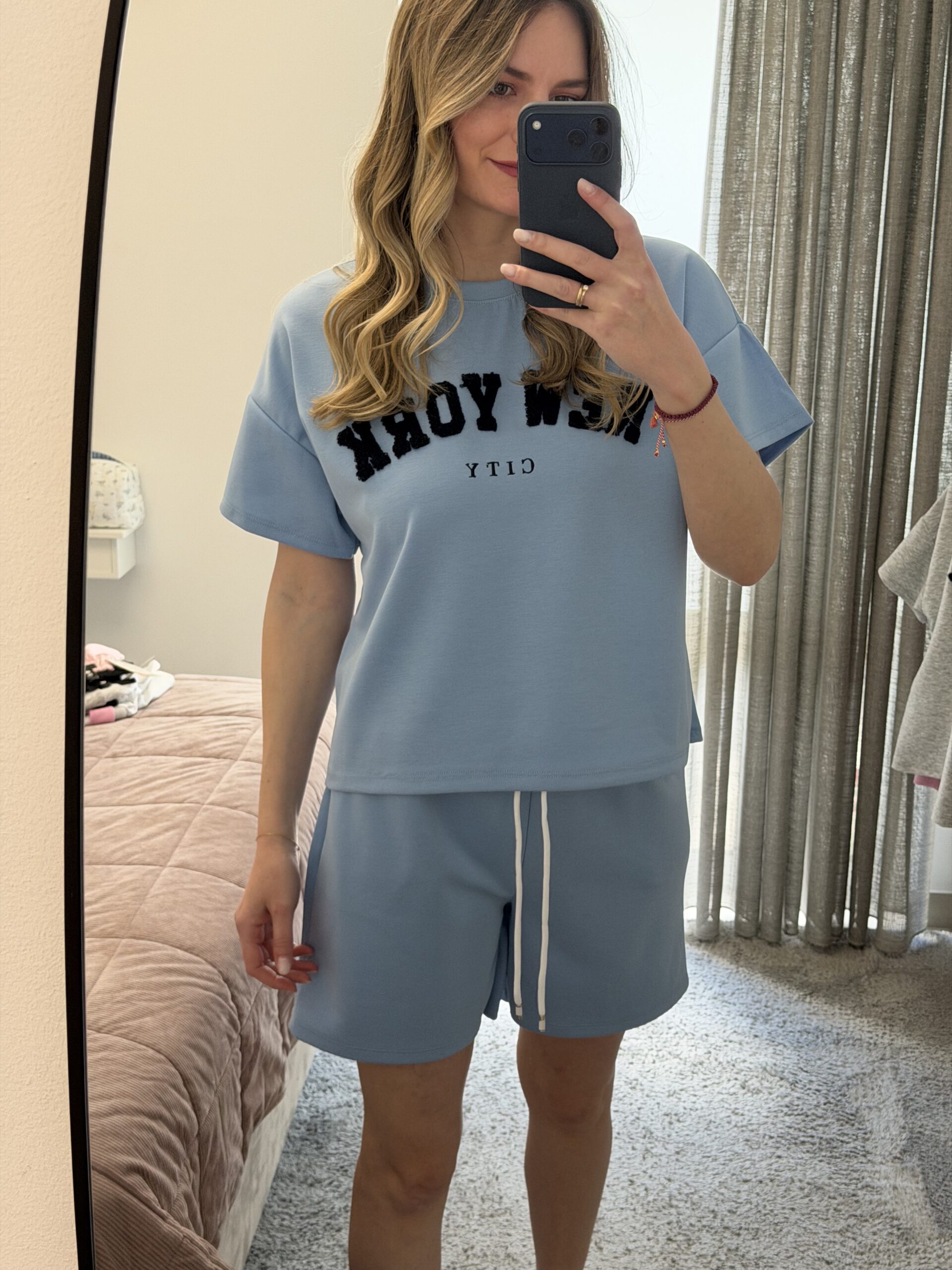 Σετ μπλούζα με σορτς. Η μπλούζα έχει λογότυπο σε ύφανση πετσετέ. Το σορτς έχει λάστιο στη μέση και κορδόνι. Στο πλάι έχει τσέπες.